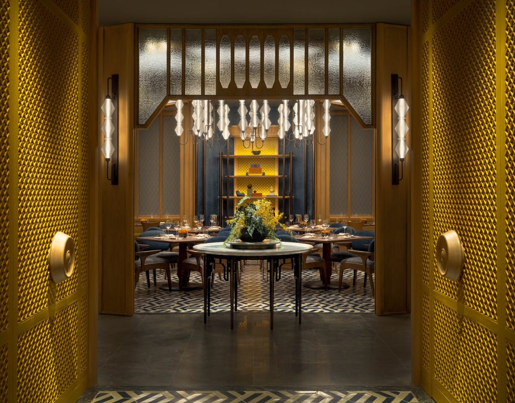 The Pavilion restaurant on the ground level is a striking gestalt of light, form, and composition. Conceived as a whimsical trial of three contemporary timber pavilions, this dining venue is a genuine celebration of tropical colours and the mystical atmosphere of the East. Each area is garnished with an eclectic array of intricate high-gloss lattice lacquer wall panels in deep yellow and sapphire blue.