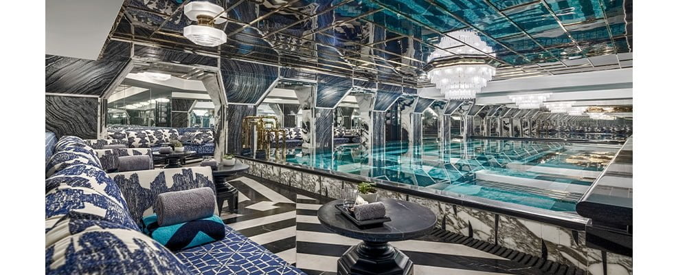 The Regale Spa is an exquisite mix of bright prosperous reds with rich overtones in ebony, blue and gold and features a fitness centre, pool, treatment rooms, steam room, and sauna. The pool, which could have easily been a simple expanse of water is a piece of theatre in itself – a dizzying art deco fantasy in black, white, and blue, and with Bill’s signature explosion of dramatic and opulent lighting, which only adds to the effect once reflected back from the water.