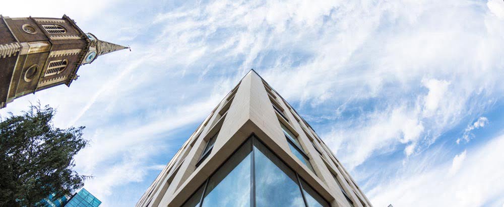 Between green areas and tree-lined streets, a welcoming new building stands proudly next to the historic Grade 1 listed church of St Botolph without Aldgate, an 18th century church building made of brick with stone quoins and an obelisk spire. The church’s new neighbour is unassuming on first glance. It fits its surroundings perfectly with its smart but uncomplicated appearance yet manages at the same time to present itself with a friendlier façade when compared to other buildings in the area. This is perhaps helped by the ground floor restaurant on one side of the building, which is softened with relaxed tables and chairs dotted outside the big, open windows.