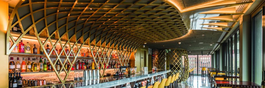 Back through to the lobby and a dedicated lift takes visitors to the very top of the building, where the hotel’s crowning glory takes pride of place – the Jin Bo Law Skybar. Having won planning permission separately to the rest of the build, the skybar was only unveiled this summer, much to the delight of everyone involved. Tying it in with the hotel’s signature gold theme, the skybar glistens with beautiful detailing throughout with the bar itself ensconced in a fabulous curved overhead golden trellis. A smooth grey and white marble bar top links seamlessly to the flooring, and geometric tiles in charcoals and light ash tones bring everything together.