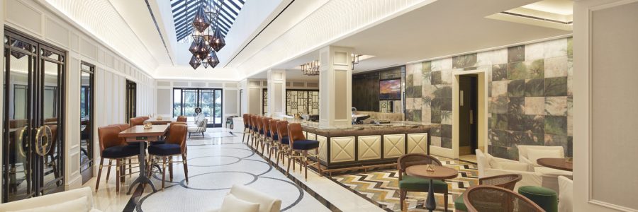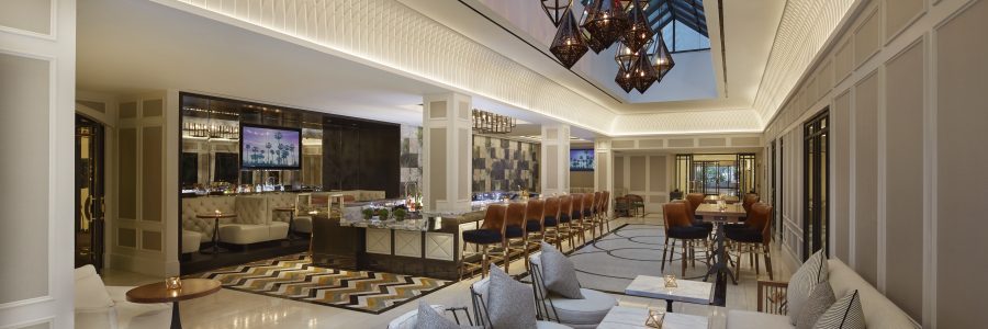 Among the design highlights is the island bar, with its studded leather panels and ‘white Beauty’ polished marble stone top. The tropical motif covering the surrounding wall is the anchor point for the whole space. Lantern-inspired light installations, collection of fresh textures and prints help create understated and relaxed luxury. The majority of the furniture is bespoke and has been specifically designed for the hotel using local materials as well as local manufacturers.