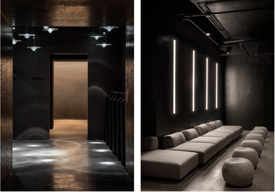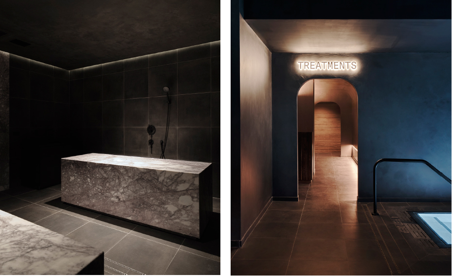 As guests enter Bathhouse through the ground floor lobby, they are welcomed by a boulder-like reception desk made of two types of travertine. Portals of illuminated fluted glass emphasise the guests’ journeys and transition, and a heavy black stone back wall with a vertical beacon of light in the centre resembles a “light at the end of the tunnel”. Guests descend a compact black stair, the first of several thresholds guiding them on their journey into the unknown. Visitors emerge into the locker rooms at the first of two subterranean levels.