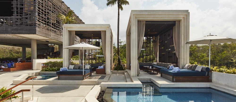 Visitors to the Dayclub are greeted by cast terrazzo stone cabanas which have a simple, textured finish and a stepped entry, as if they have been carved out of the cliffside landscape. Light fixtures are inspired by traditional Indonesian weaves, with a twist on the shape and style.