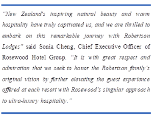 Staying true to Rosewood’s guiding A Sense of Place®philosophy, New Zealand’s authentic and unique spirit will inform every element of the refreshed guest experience, inviting both legacy and first time visitors to revel in surreal settings. With great respect for the heritage of the properties and the foundation that the Robertson family has built, Rosewood will carefully preserve and sustain the friendly service style and care for native culture that have defined these destinations over the decades.