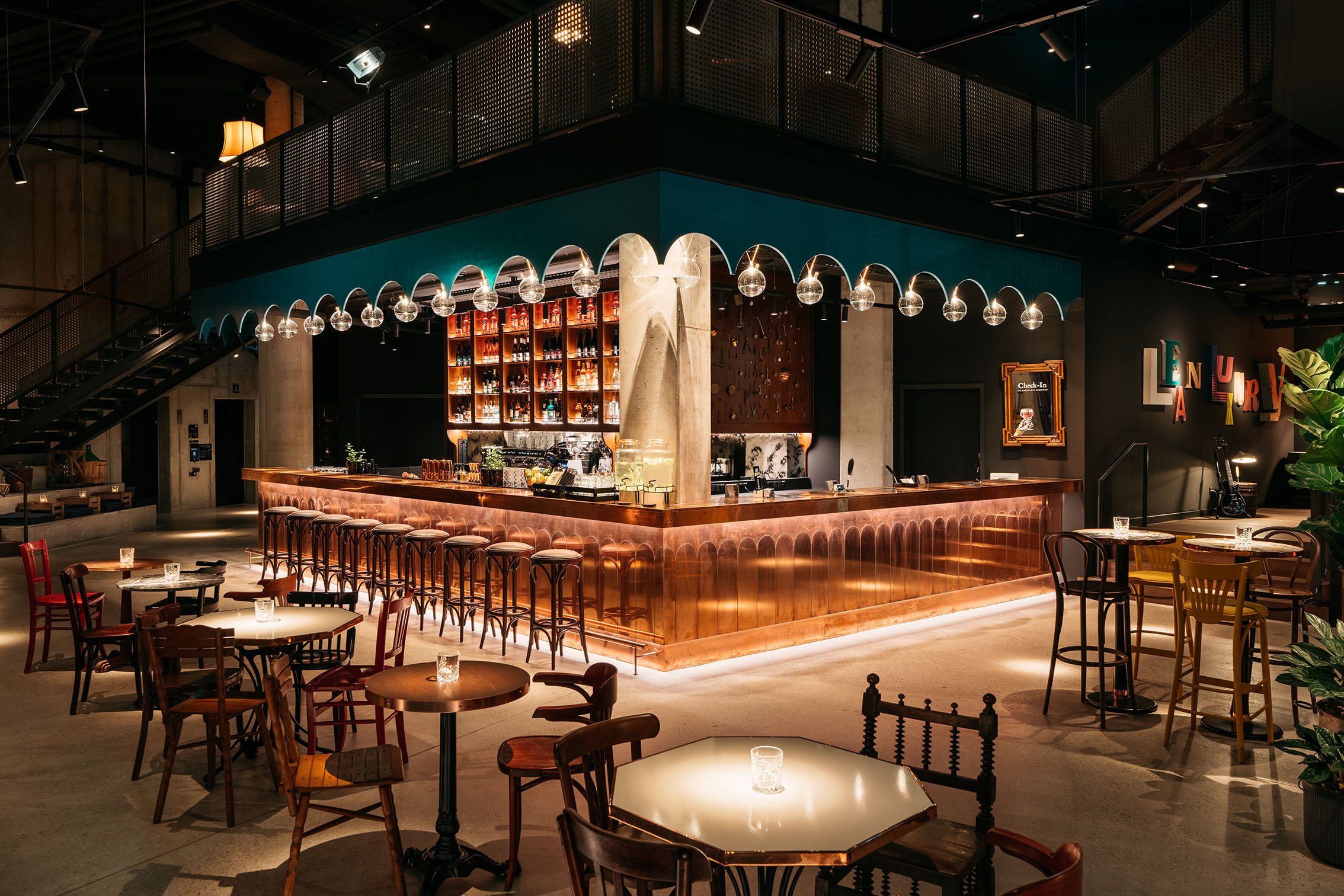 Inspired by alchemy, wine production and distilleries, there is a lot of copper in the design. The absolute highlight is the 24/7 bar – the heart of every Ruby Hotel – which shines completely in polished copper in the Hanna, rounded off by the countless indirectly illuminated filled round flasks above the bar.