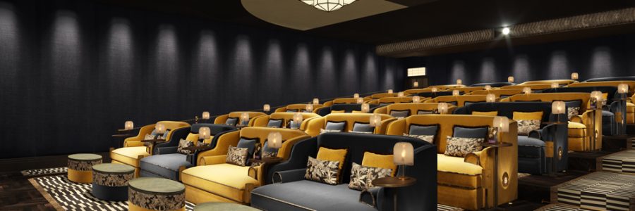 The four screening studios are glamorous boutique-sized cinema auditoria that use a palette of midnight blue and gold. Decorative trims and border details frame bold painted walls, creating a powerful backdrop to the relaxing atmosphere.