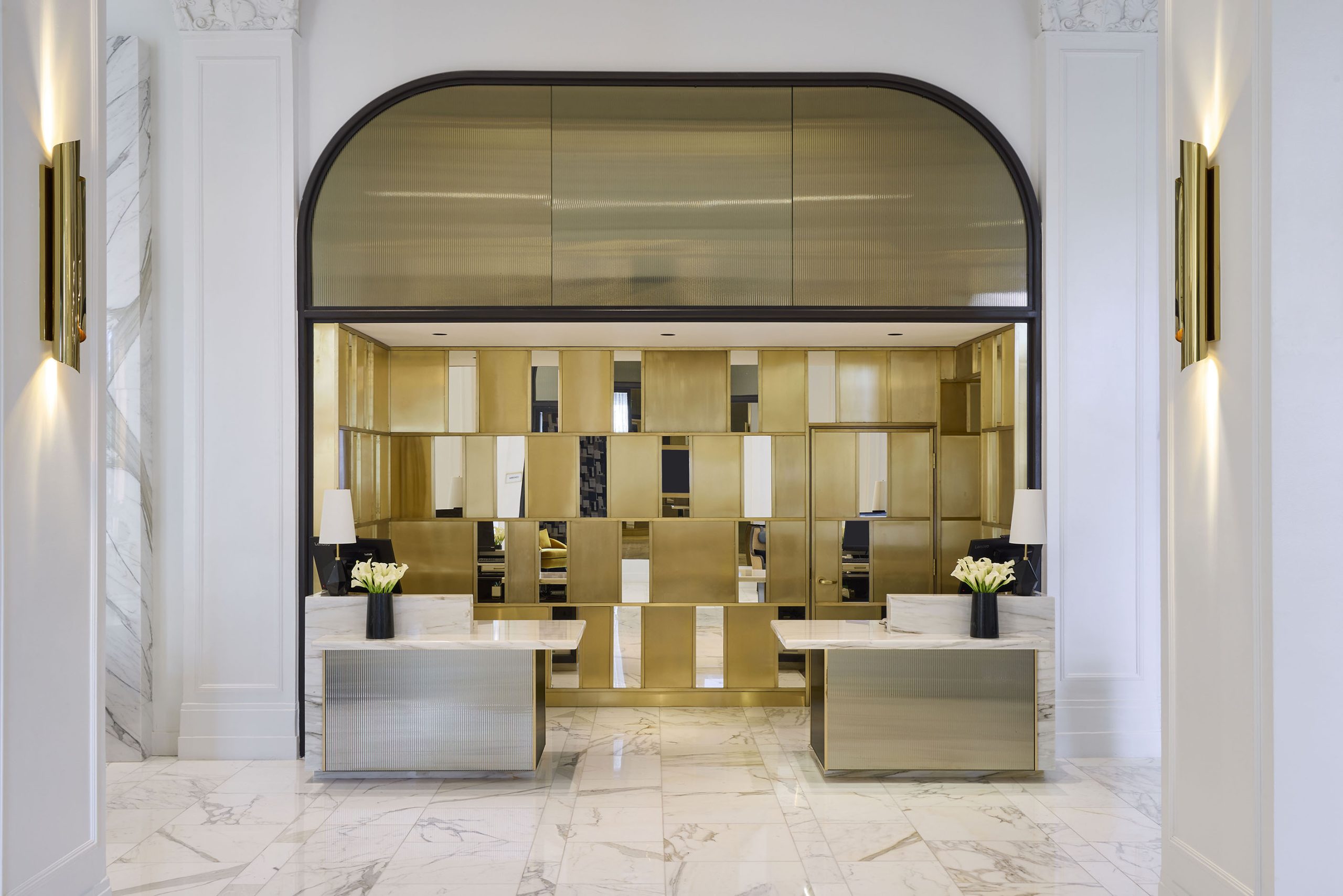 In the grand lobby, poetic symmetry and striking elements of contrast create a welcome worthy of the Roaring Twenties. Credit for all images: Noah Webb