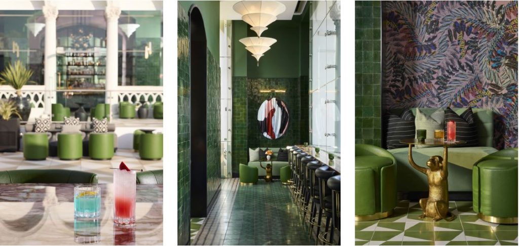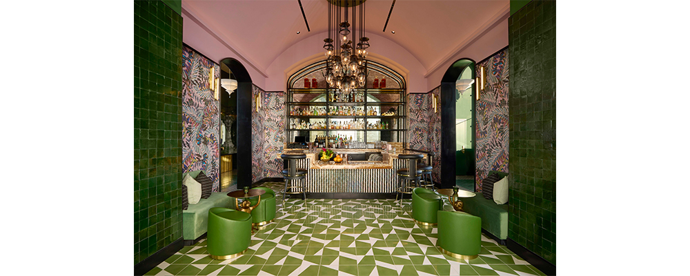 At Halo rooftop lounge, gorgeous shades of emerald green and pink transform sunset champagne and nightcaps into ceremony. Vibrantly layered design elements put on a symphony for the senses both indoors and out, from tile selections to wallcoverings and fabrics.