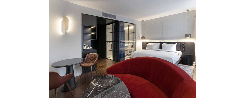 The materials used interpret the lifestyle of a five-star luxury hotel, in line with the new demand towards which the hospitality industry is oriented. The choice of Studio Marco Piva has privileged warm materials such as wood and leather in dialogue with contemporary elements such as glass and metal, which could at the same time meet the standards required by certifications and the requirements demanded in the contract sector. The wood essences are effect wood with particularly resistant and high-quality laminated panels. The leathers are eco-leathers that respond to a need for greater durability and ease of cleaning. The language of colors tells a palette in shades of blue with accents of red and a base of shades of gray. For the headboards and technical fabric curtains that create the privacy area, midnight blue was chosen. A touch of red characterizes the upholstery, such as sofas or armchairs. In general, grays dominate in various shades, up to blacks that define the spaces.