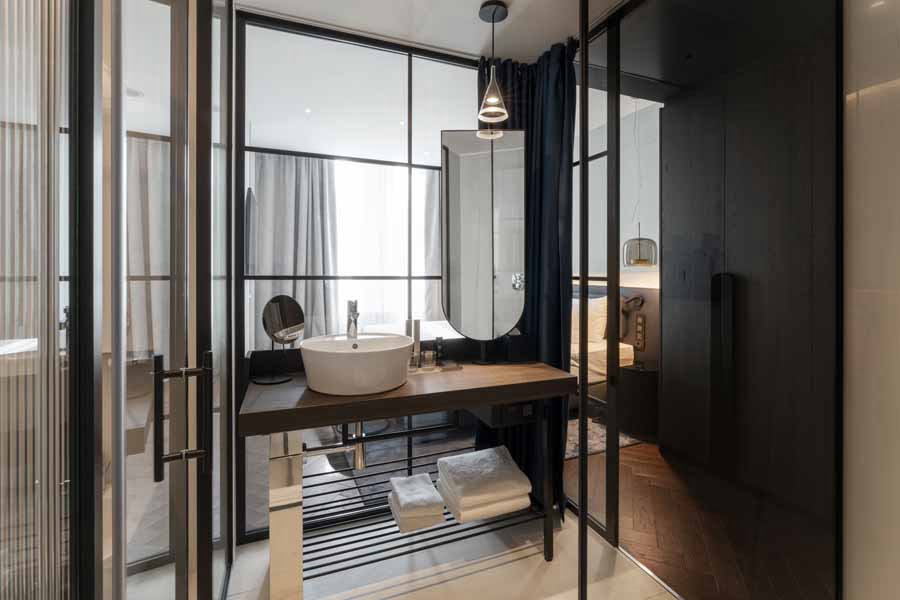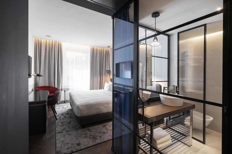The interior design of the Radisson Collection Hotel, Santa Sofia Milan is characterized by a contemporary urban style with a domestic feel. The design approach was to create a style that combined the concepts of “business”, “urban”, and “loft”. The rooms, like small urban lofts, have large windows and black frames to provide greater brightness and permeability to the bathroom and sleeping area, and soft dark curtains that can be used to create privacy between the two spaces when needed.