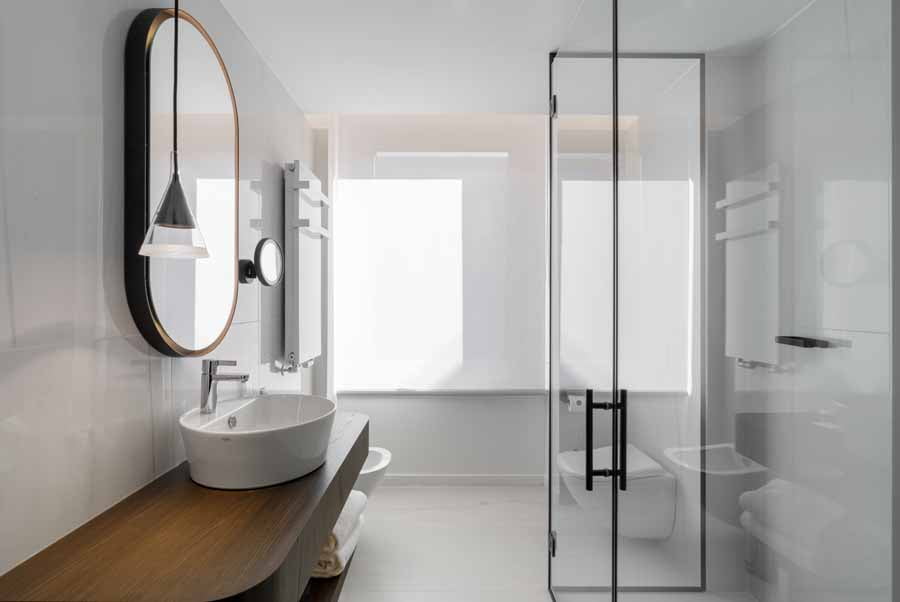 Light also plays an essential role in the bathroom area thanks to the presence of glass bathrooms that allow natural light to penetrate and make the environment bright, while privacy is guaranteed through the use of blackout curtains.