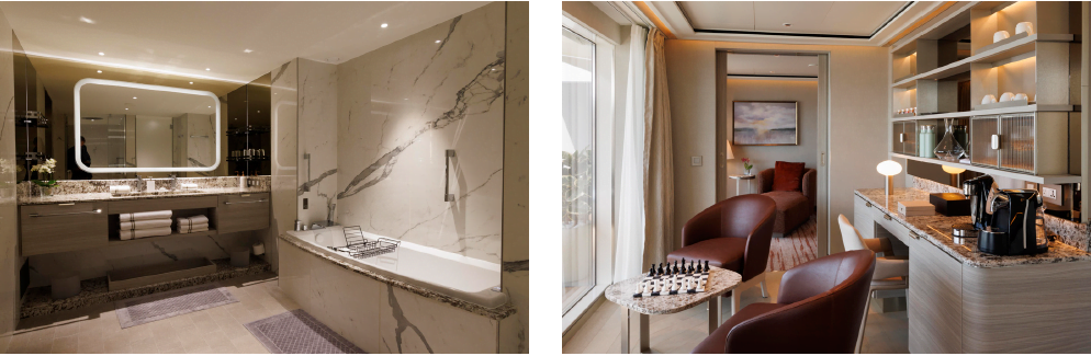 One of the most spacious cruise ships ever built, Silver Nova has a space-to-guest ratio of 75 GRT-per-guest — the highest in Silversea’s fleet. She offers one of the most personalised levels of service at sea with a crew-to-guest ratio of 1:1.3, including butler service for all suites. Silver Nova hosts up to 728 guests in 13 different suite categories — the largest variety of suites in Silversea’s history, and among the most spacious accommodations of any cruise ship. Every suite offers guests the use of a private veranda. The largest option is the new 123m2 (1,324ft2) Otium Suite, with floor-to-ceiling windows providing 270-degree views from the ship’s premium aft-corner position. It also features a 40m2(431ft2) balcony with its own whirlpool.