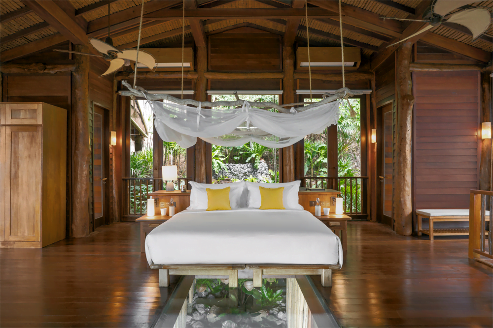 Positioned high on the hill, the 2,422 square-foot (225 square-metre) villa has Thai-inspired interiors which have been infused with a contemporary twist and boasts an infinity pool, private cinema, sunken dining area, plus a private upper-deck and fitness studio. All main walls are made out of glass offering 360-degree views of the iconic limestone karsts of Phang Nga Bay. There’s plenty of room for everyone to sunbathe on the surrounding decks that blend seamlessly with the pristine jungle environment of the island.