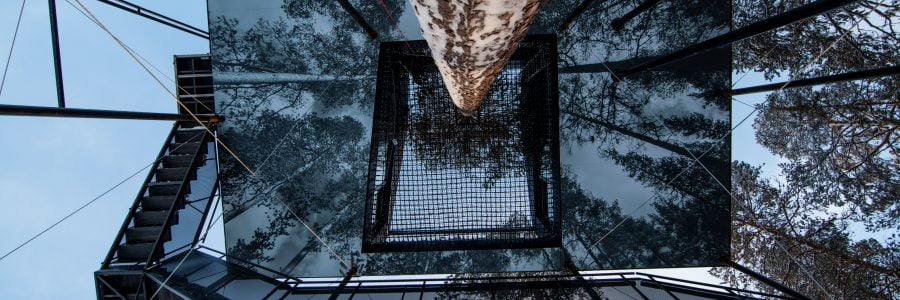 In the tall pine forest of Northern Sweden, where the tricolored tree trunks stretch up to the soaring crowns, a new addition to the renowned Treehotel has opened. Hovering ten meters above the ground within the tree canopy, the Snøhetta-designed 7th room provides its guests with a breathtaking view of the Lapland treetops and the Lule River. With focus on the surrounding nature, the design features large windows, a netted terrace suspended above the forest floor, and a tree stretching up through the cabin. The boundaries between indoors and outdoors are blurred, making the cabin part of the forest.