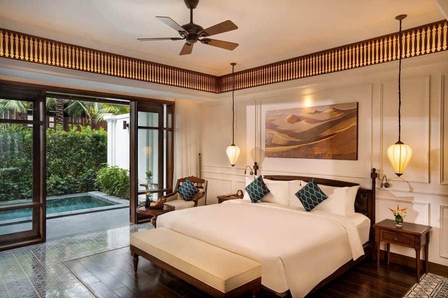 Borrowing deeply from the templates of architecture inspired by the grand old French villas in Hanoi, and the garden homes of Central Vietnam, the new resort pays homage to both colonial-era and classic Vietnamese aesthetics. To wit, the customized encaustic mosaic tiles, Cham decorative vases and statues on plinths, teak furniture crafted from sustainable forests, stone from Thanh Hoa and Nghe An, and authentic thatched roofs from Binh Thuan.