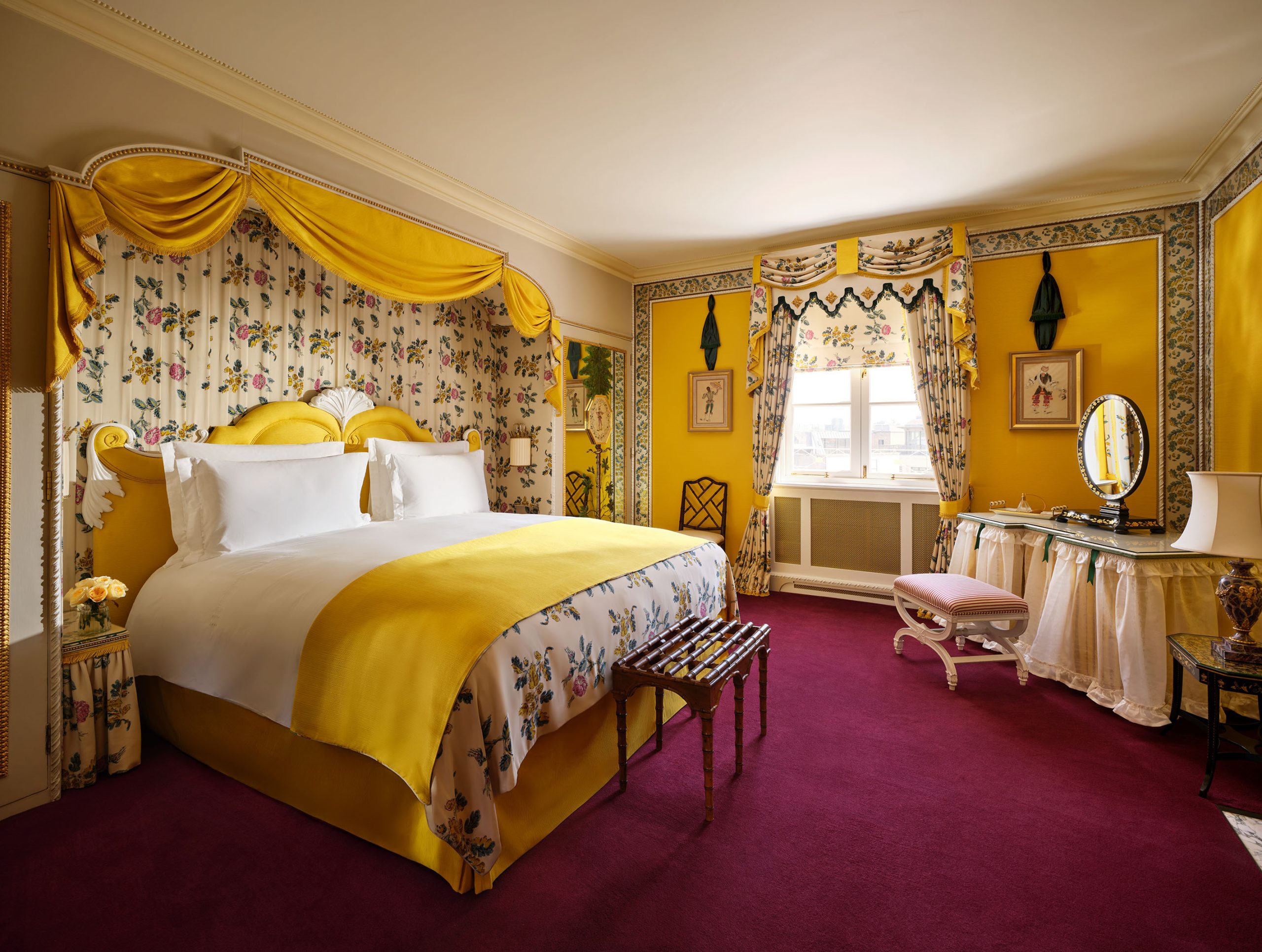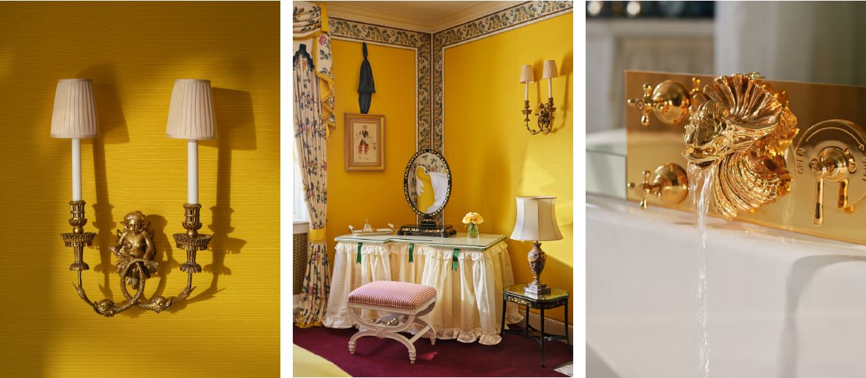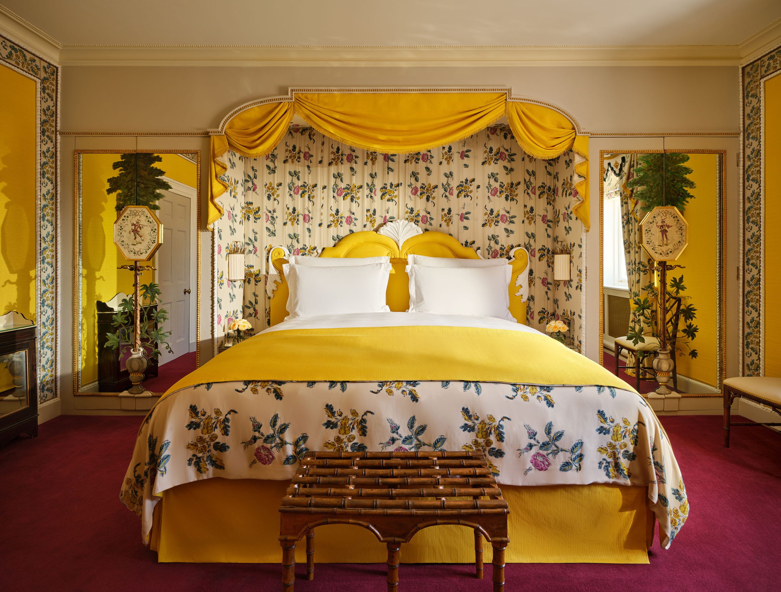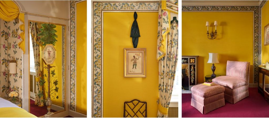 The floral silk wallcoverings, originally selected by Messel, were reissued exclusively for the suite by Sekers in collaboration with Sanderson Design Group. Other fabrics include azalea-pink silks and a re-woven imperial yellow Ottoman cloth for the bed canopy, produced in Italy.