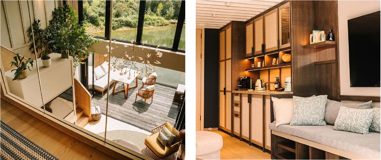 With façade materials chosen as a reflection of the West Sussex countryside and through products derived from nature, the lodges bring characteristics of the natural world into the built spaces to create a calming, soothing space. Reflecting Exclusive Collection’s commitment to sustainability as a B Corp organisation, the lodges have been designed to respect the surrounding ecology using innovative, up-cycled, locally sourced or naturally derived materials.