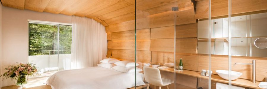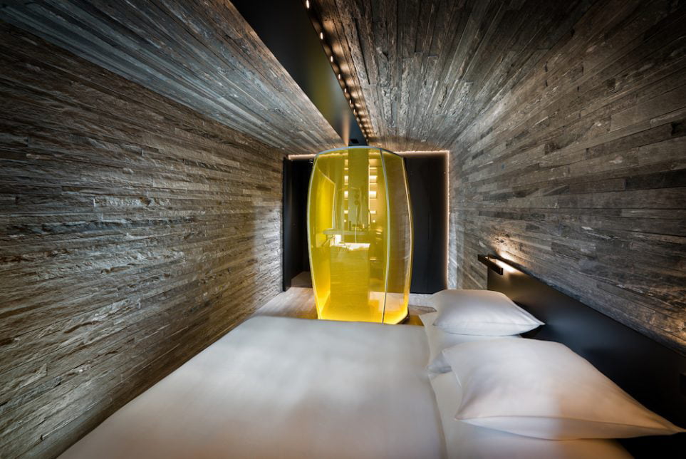 Thom Mayne built two rooms in two contrasting themes: wood and stone. The American Pritzker prize-winner used select wood and stone materials for his suites. For the wood-themed room, indigenous panels run from floor to the ceiling. In the stone room, Vals quartzite and its interesting milky patterns coat the entire space. An awe-inspiring sculpture engulfs the shower for both spaces.
