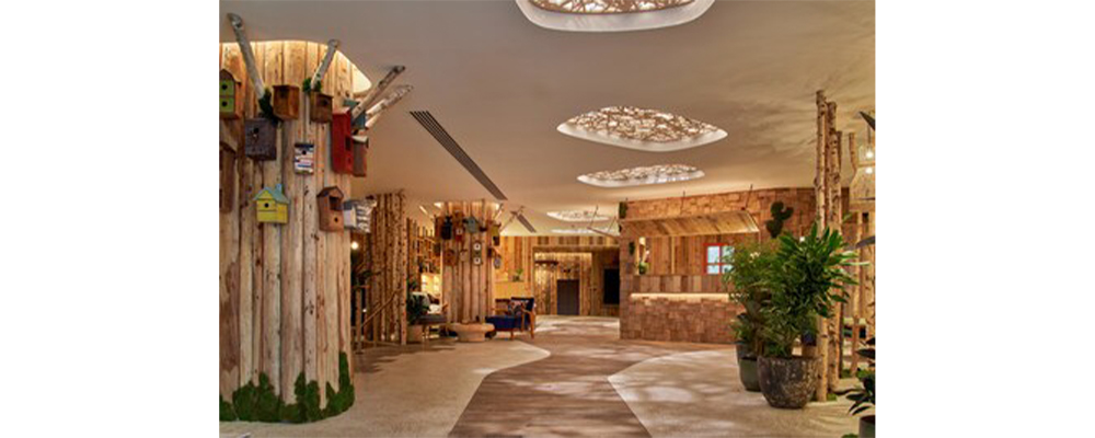 Set against the concrete buildings of Blackfriars, Treehouse’s HYVERT living green wall façade creates an oasis of greenery and gives a glimpse of what lies beyond. Guests enter into a lobby that is designed to look like a magical forest straight out of a storybook, with a dramatic indoor-outdoor feature tree that winds its way through the building and a lush canopy overhead. From the mismatched furniture to the patchwork rugs, it’s designed to be a place where imaginations can run wild. Each corner holds a surprise, whether it’s a hidden alcove for reading or a whimsical mural that ignites the imagination. The hotel’s rooftop spaces add to the appeal with a “buzzy” onsite apiary and views for miles.