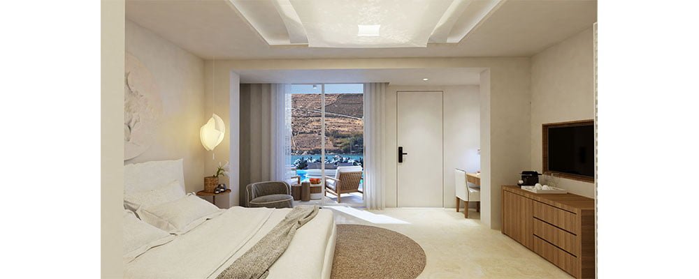 Built in 1960, visually striking and harmoniously landscaped into its natural environment, born from the same stone as the existing sea walls, and hailing across the way to Delos, Mykonos Theoxenia was born as a mythic establishment that set the pace for an era of eclectic travel. Now a landmark domaine and protected UNESCO heritage site, the newly renovated and re-imagined hotel will boast 74 elegant rooms with stunning views and four signature suites with private swimming pools and terrace to offer an extra touch of indulgence.