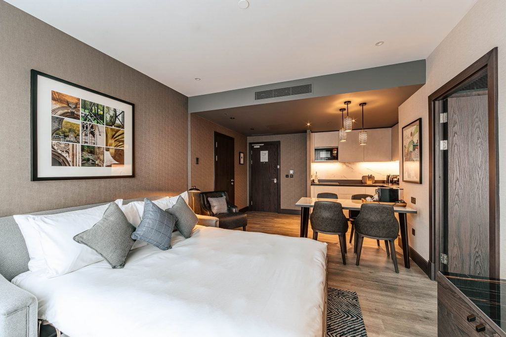 The Fellows House offers 131 apartments. Their aesthetic is contemporary and pared-back – space for guests to make their own. Pale timber floors and a monochrome colour palette are paired with marble topped tables and dark timber features and furniture. Punches of colour are introduced in the framed antique-style Cambridge maps which pay homage to alumni and fellows, Charles Darwin, Henry Cavendish, John Flamsteed and Siegfried Sassoon.