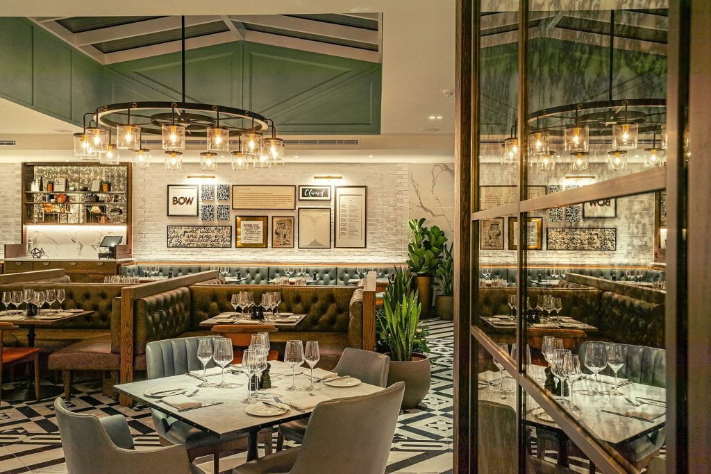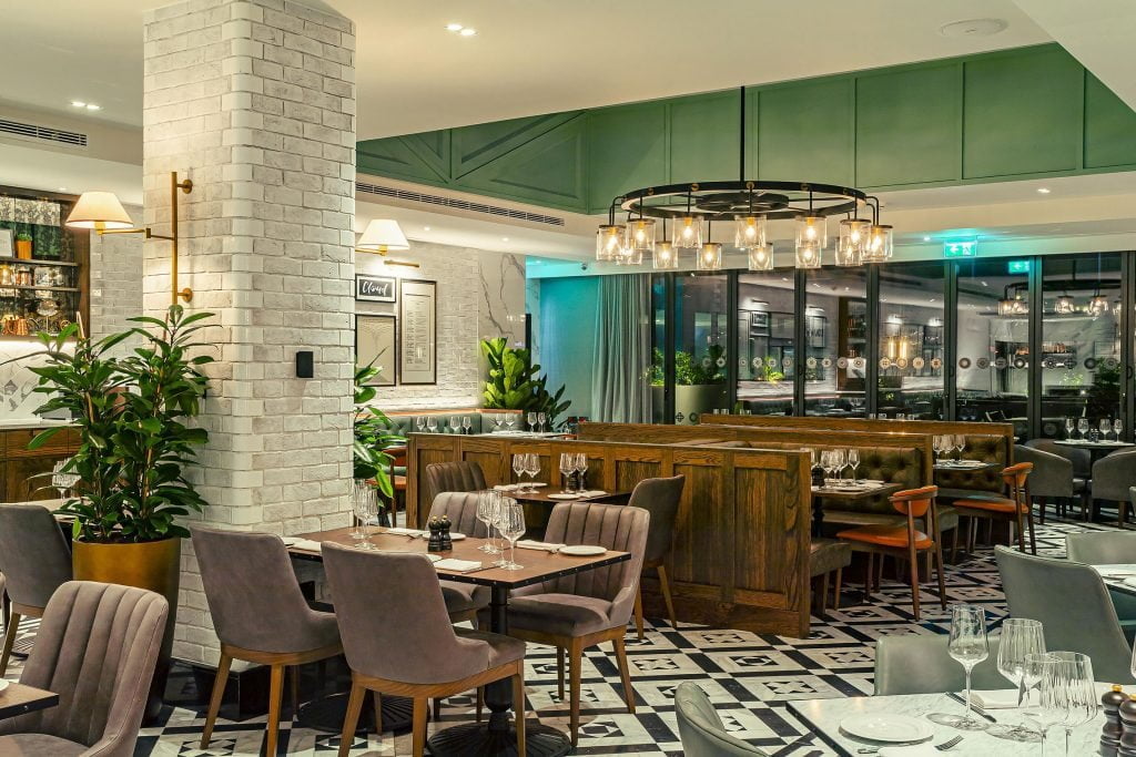 The Folio Kitchen combines the contemporary and classic within a fresh and inviting colour palette. Walls and columns are clad in whitewashed brick and the accent colour is Cambridge Blue with punches of ochre orange in the leather upholstery. A Calacatta marble sharing table together with marble topped dining tables are elegant and sophisticated. They also provide a counterpoint to the traditional millwork of the roof lantern recess and the timber banquets as well as the geometric black and white tiling to the floor, all of which are a nod to historic Cambridge. Above the fireplace, a portrait of Sir Michael Foster looks down over proceedings much as he might have once surveyed Trinity College’s dining hall in his days as a fellow there.