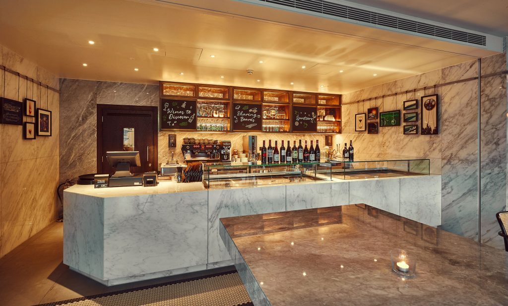 Situated just inside the main entrance to The Fellows House and with its own street entrance, The Sage of Cambridge is a café intended every bit as much for the locals as for hotel guests. Its gleaming marble surfaces, comfortable bistro-style chairs and jaunty original artwork are all designed to catch the eye and attract customers in for a morning coffee, a spot of co-working or a light lunch. As dusk falls, the ambience changes and the café becomes a space ideal for meeting friends over aperitifs as the lights are dimmed and the custom-designed bar allows staff to easily convert it from daytime service into a glowing cocktail bar.