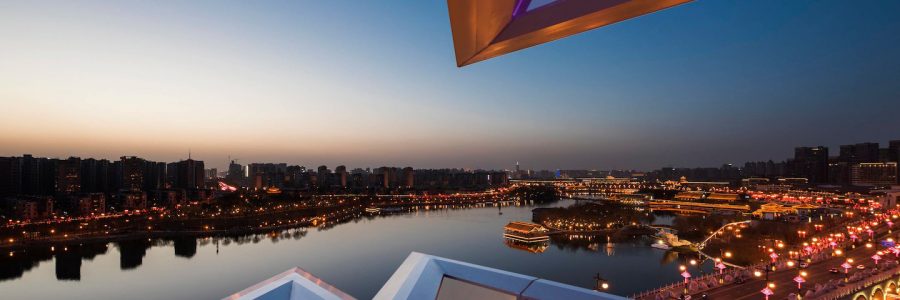 An enormous eye-catching multimedia art installation with digital fragments of Tang dynasty architecture welcomes guests through a floating garden entrance. The 17-meter-high Living Room is a showpiece of the hotel’s inspired design, boasting lighted floating curves, hanging artistic details and sloping divisions sweeping up from the floor, each inspired by the famous palace wall and historic depictions of the nearby Silk Road. Artworks of acrobatic pottery figurines pay tribute to the “Welcoming Ceremony” in ancient times, luring guests to explore further.