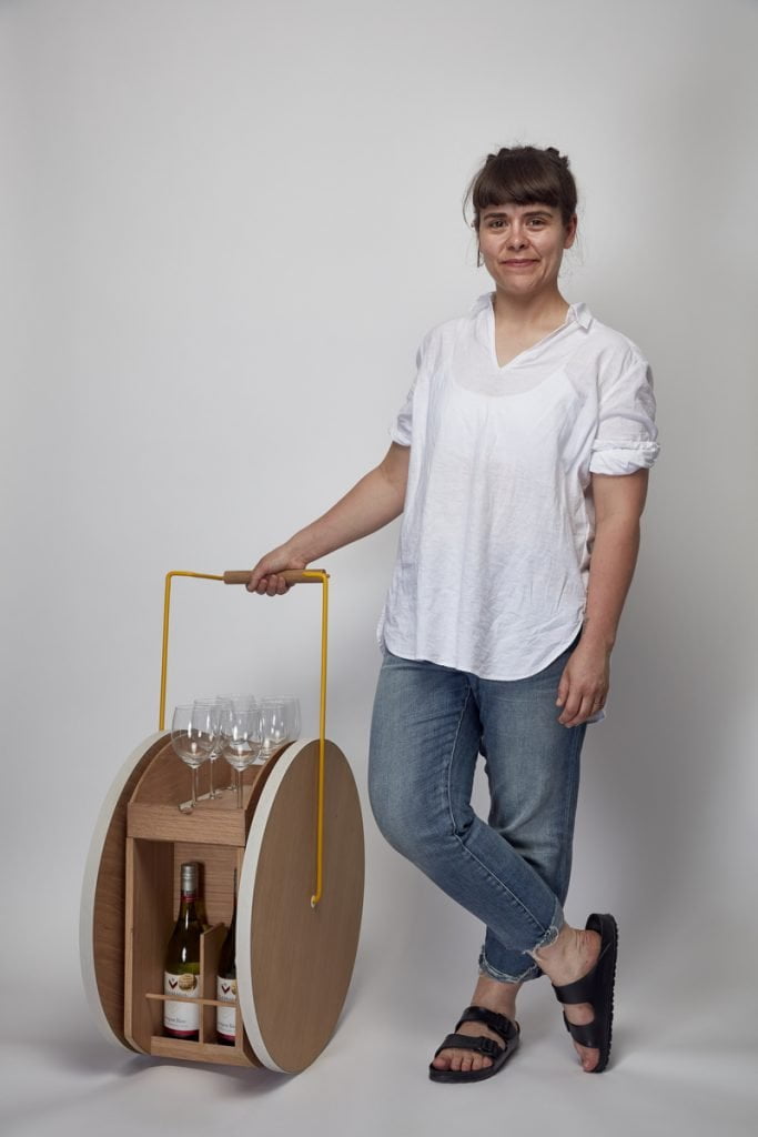 Description of work: ‘A rolling drinks cabinet made from oak with grey lino accents and yellow steel components.’
