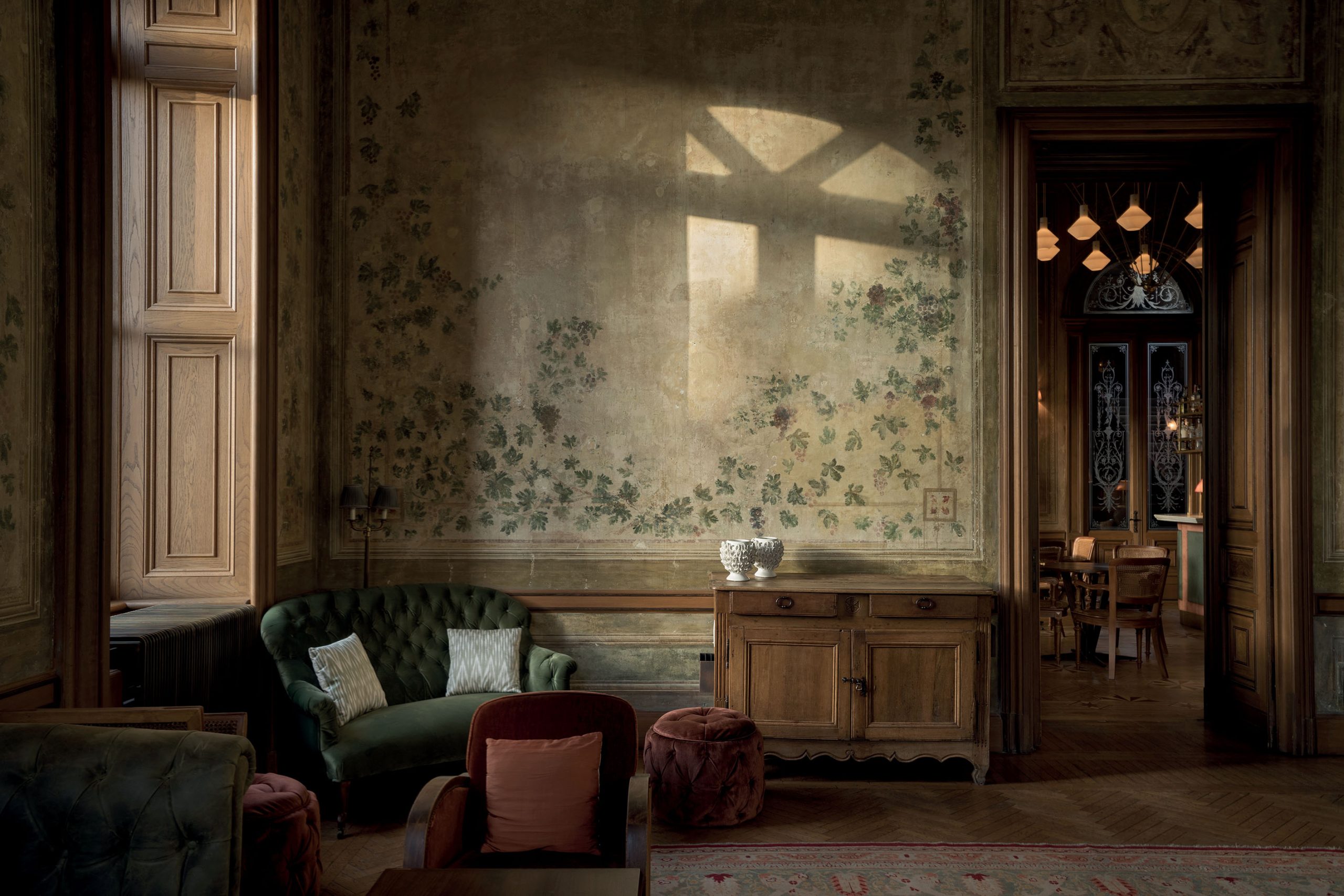Like the studio’s location, much of Thurstan’s work carries an unmistakable sense of history. In collaboration with decorative artists, he creates walls washed with faded murals that seem the result of a gentle restoration rather than a fresh commission. Hand-painted faux marbles, richly grained woods, layered textures and natural materials lend depth and warmth. Antique and modern bespoke pieces sit comfortably side by side, their forms in quiet conversation. Original paintings and reproductions, set in decorative frames, are difficult to tell apart, such is the calibre of the artists he works with.