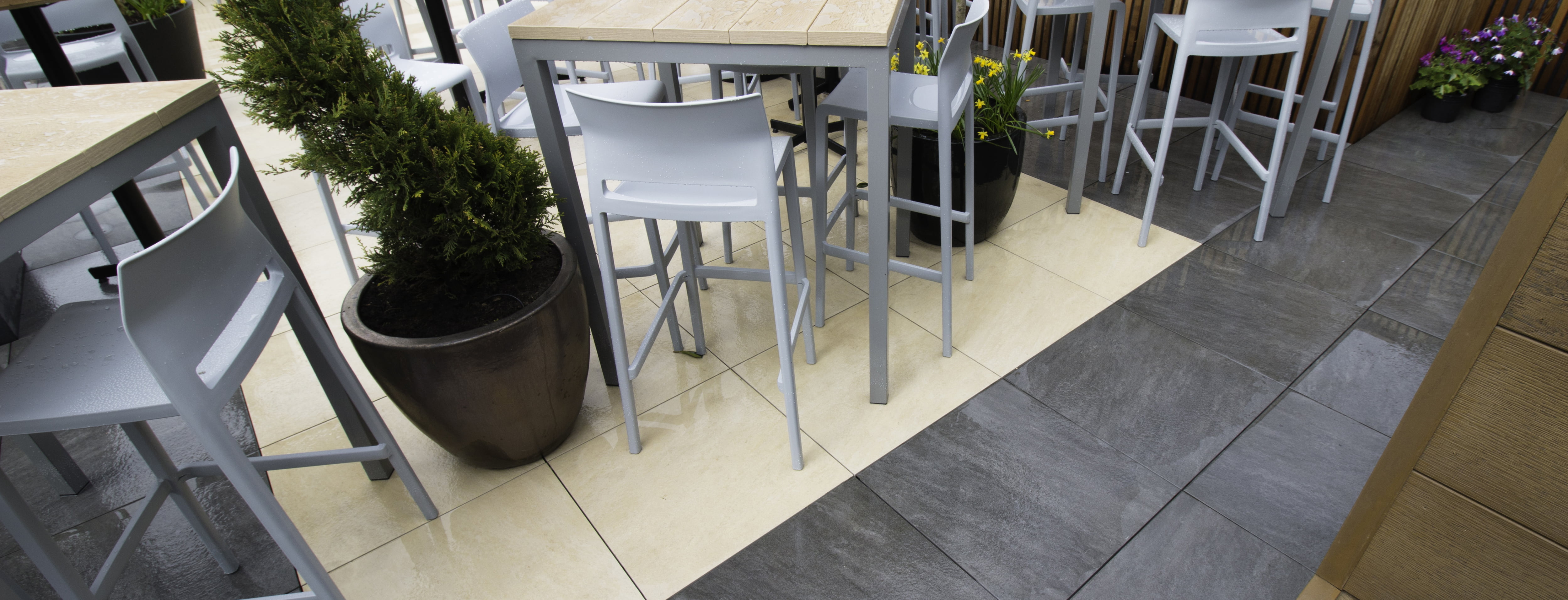At the top of a beautifully presented public house restaurant in the heart of Andover sits a newly refurbished wrap around roof terrace. For an exterior flooring surface that demanded excellent slip resistance for safety under foot and aesthetically pleasing looks, Surface 360 were chosen to supply and install their high performance, Levato Mono Quartz Style 20mm porcelain paving tile range.