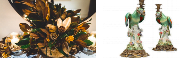 Natalia has chosen the well-proportioned FrenchOrmolu table synonymous with classical style, complemented with Russian brass mounted mahogany armchairs, selected for their comfort and elegant geometric design. Natalia selected the 1870s French gilded brass candle holders to provide elegance and a reference to the romance of London’s fine dining rooms. Murano glassware in a wine-red accent adds warm colour and eclecticism, in keeping with Natalia’s talent for tastefully bringing together different eras in a stylish way. The porcelain parrot candleholders add a sense of fun and give a nod to the international influence that runs through Natalia’s designs.Placed alongside the bamboo-edged plates, the candle-holders bring a colourful sense of the tropics into the festive tablescape.