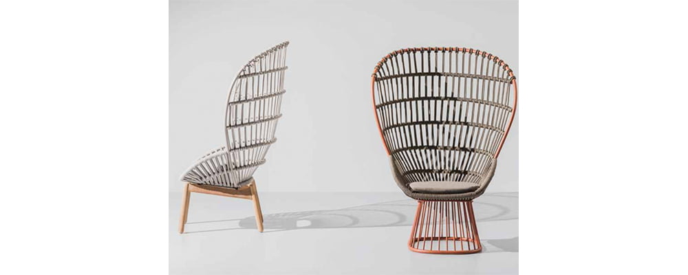 ‘Cala’ is a high backed armchair inspired by the iconic Emanuelle. The chair has a majestic spatial presence with transparent and light surfaces. The open weave of the rope provides a latticed window for visual privacy while maintaining a connection to the natural elements. ‘Cala’ may be used for outdoor dining as well as a chair to lounge in. The wide selection of metal coatings, rope colours and cushion fabrics offer many possibilities to tailor the identity of the chair to suit different projects.