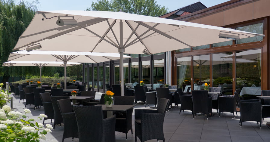 Robust, gigantic and above all impressive! Giant umbrella Big Ben was designed specifically for long-term commercial use. The parasol presents itself as a multifunctional and extremely robust parasol for hospitality. In the wind tunnel testing it resisted even stormy winds of up to 100km/h for its 3x3m version. Available in many sizes, Big Ben is suitable for large terraces as well as narrow outdoor areas of small cafes. Optional extras such as gutters, side walls, advertising prints and integrated lighting and heating systems make the Big Ben a multifunctional genius. If you choose Big Ben, you choose the ultimate in protective shade.