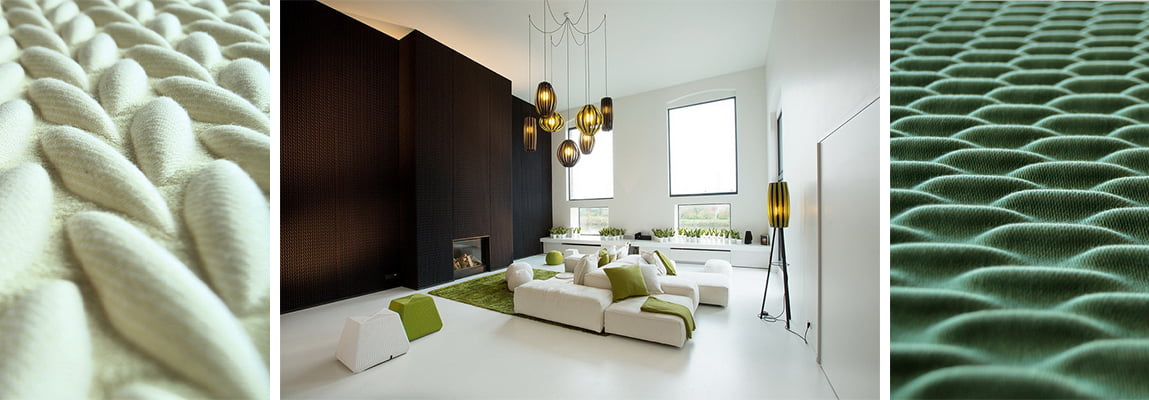 Architextiles 3D Acoustic Textiles is a series of sound absorbing textiles with a woven 3D structure. Due to their ribbed texture, these fabrics absorb sound waves much better than flat textiles. Thus contributing to a more muted environment. These textile panels combine two features: noise reduction and decoration. The undulating surface creates a play of light and shadow. This conceptual approach lies at the intersection of art, design and architecture. As a result, this functionally versatile collection can be widely applied: from high end private interiors via interior designers through to large scale architecture.