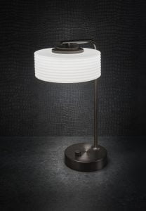 Capri features heavily ribbed Opal glass globes secured with metal threads onto knurled decorative double-stepped caps. The table lamp has a rotary dimmer switch with integral dimmable warm white LED light sources.