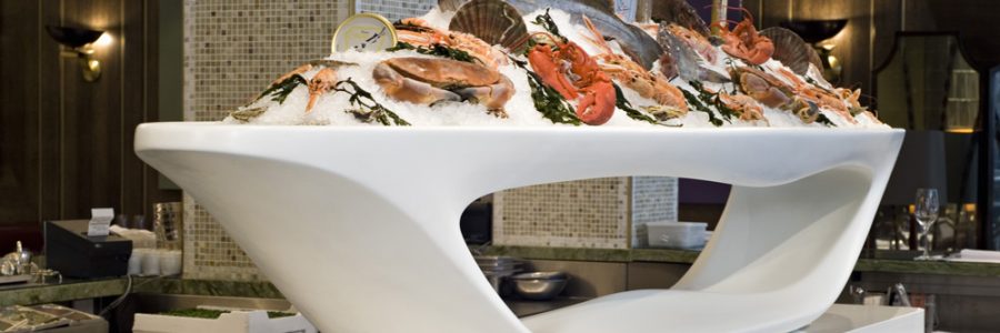 A bar inspired by Dali’s muse in Barcelona… a hotel resembling an iceberg in Bordeaux… a nautically-inspired seafood display in a top Mayfair restaurant … a popular Soho eatery with menus projected on to the table tops… glowing pod-like bathrooms in the Vilnius edition of a popular hotel brand. These are just a handful of the remarkable designs created to enhance the guest experience with Corian® Solid Surface.