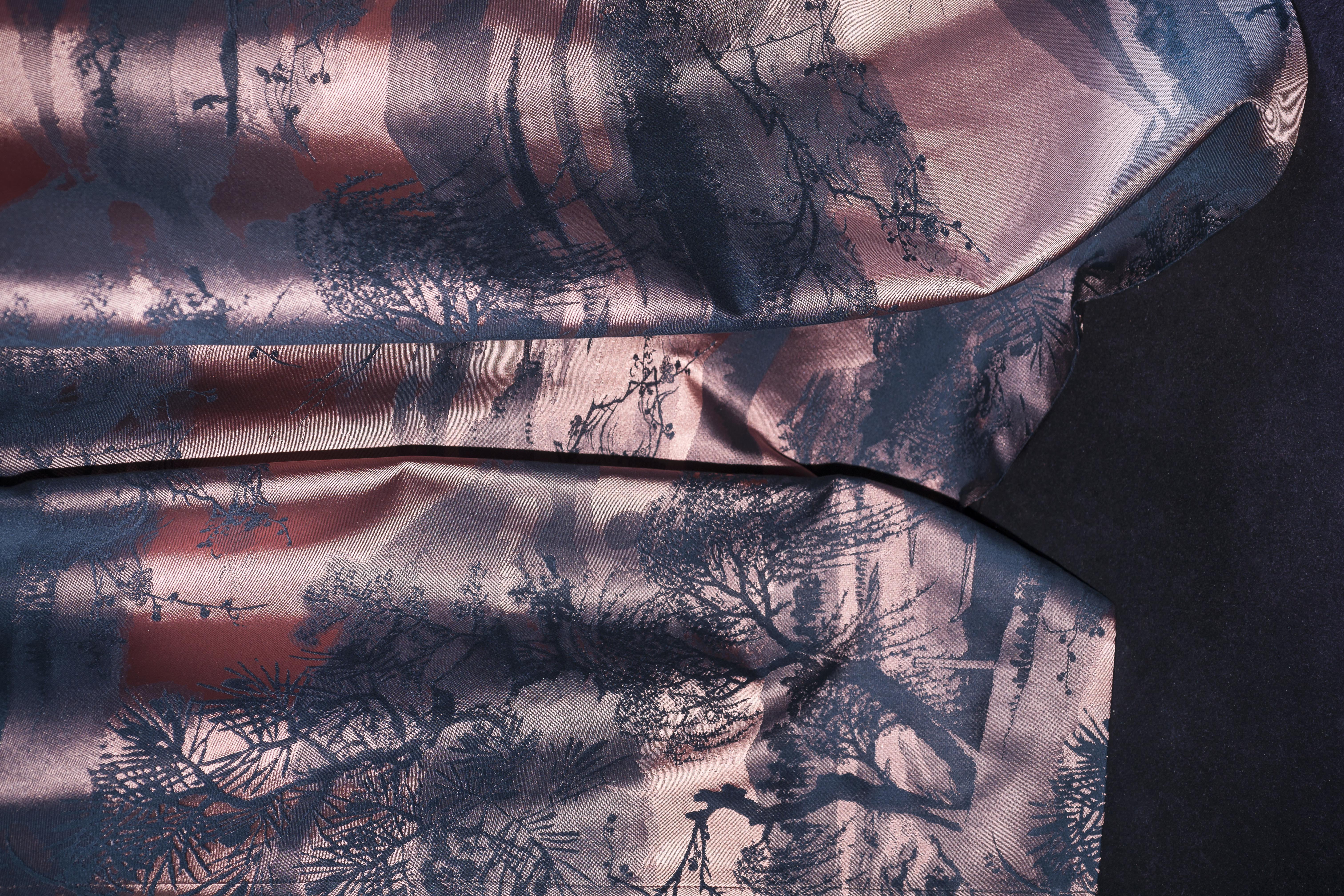 The three-dimensional and monochrome geometric design evoking refined inlays of ebony and mother-of-pearl is fruit of the technical expertise deployed in the alternate use of metallic and bulky matt yarns on a satin ground.