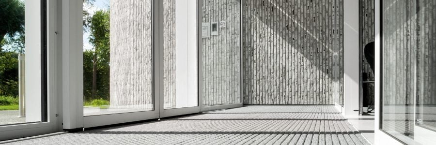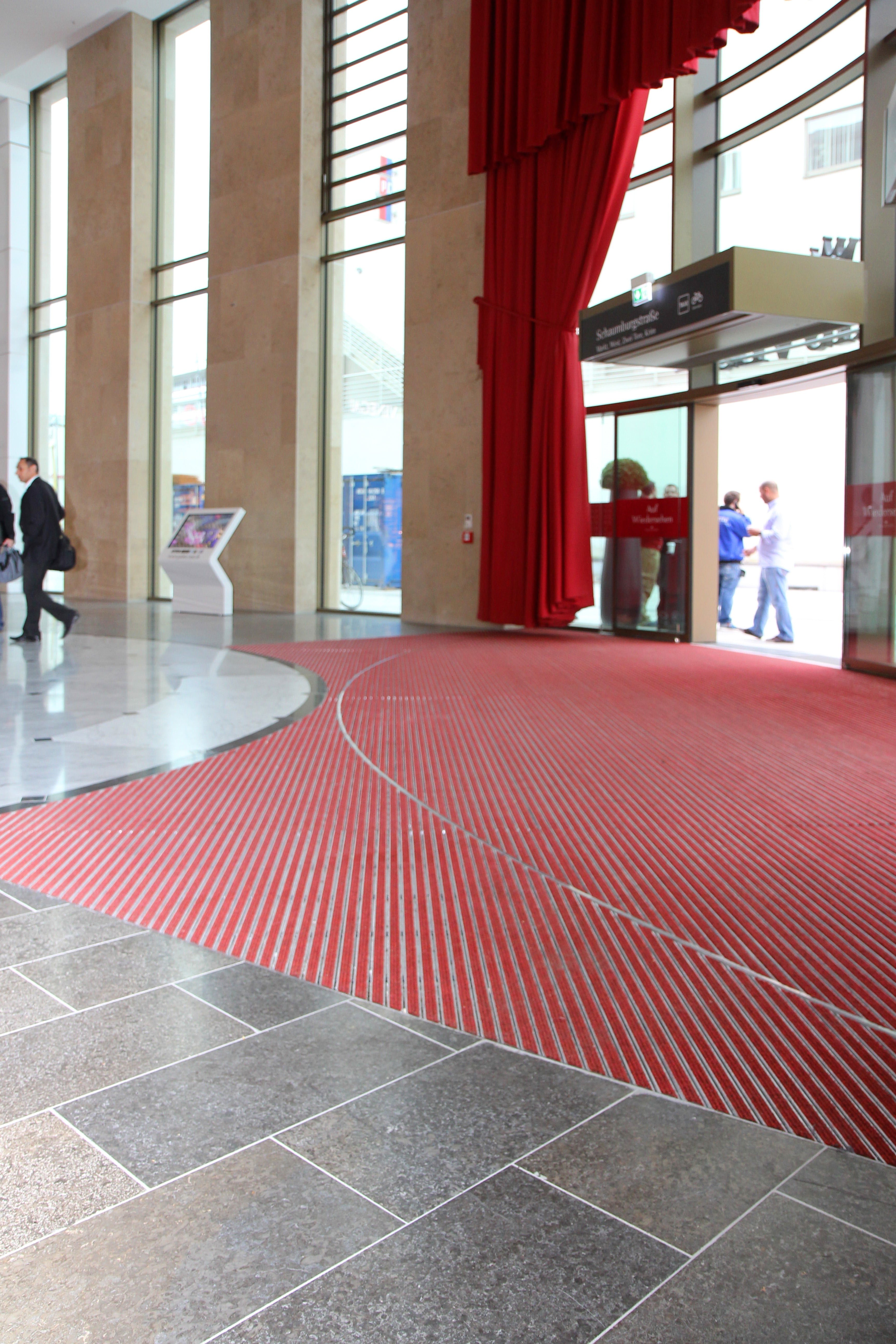 The first impression on entering a building plays a crucial part in the overall effect on the visitor. Entrance areas therefore require an environment that combines a welcoming atmosphere with aesthetics and functionality. We offer individual, tailor-made dirt removal systems, based on our 3-zone cleaning system concept, that trap up to 90% of dirt and moisture as people walk across them. They make a significant contribution to a pleasant reception environment and long-lasting protection of the surrounding floor coverings, as well as to a significant reduction in cleaning work throughout the building. Entrance mat systems can be supplied with rounded or angled designs and cut-outs, according to the architectural and structural requirements. The wide range of colours makes it possible to create both harmonising and contrasting designs. To increase the exclusivity of the entrance area, a large number of additional components are available, such as a LED illuminated frame system, or a stainless-steel profile with a laser-engraved personalised name.