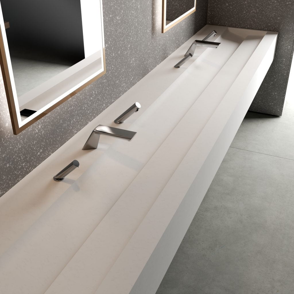 The Qubicle-designed XLERATORsync® was also developed to adapt to a variety of specification needs, either fabricated as long troughs or individual, stand-alone basins.