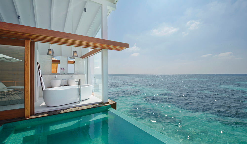 Located 70 kilometres south west of Malé in North Ari Atoll, the exclusive Kandolhu Island Resort offers 30 villas in five different styles, both over the water and on the beach. Scattered around the island’s most beautiful locations, each of the villas boast their own distinct designs, making use of traditional Maldivian architecture. All the resort’s bungalows are finished to an extremely high standard with quality fittings throughout, including Laufen ceramic sanitaryware, furniture, faucets and wellness products. ILBAGNOALESSI One bathtubs invite guests to lie back and relax while enjoying their beautiful surroundings, and are matched by washbasins and WCs from the same collection. Featuring elegant curves and minimal styling ILBAGNOALESSI One create a real style statement in this most idyllic of settings. The PALOMBA sanitaryware is another highlight of the bathrooms in many of the resort’s apartments, the organic contours of which look especially elegant in understated ambiences.