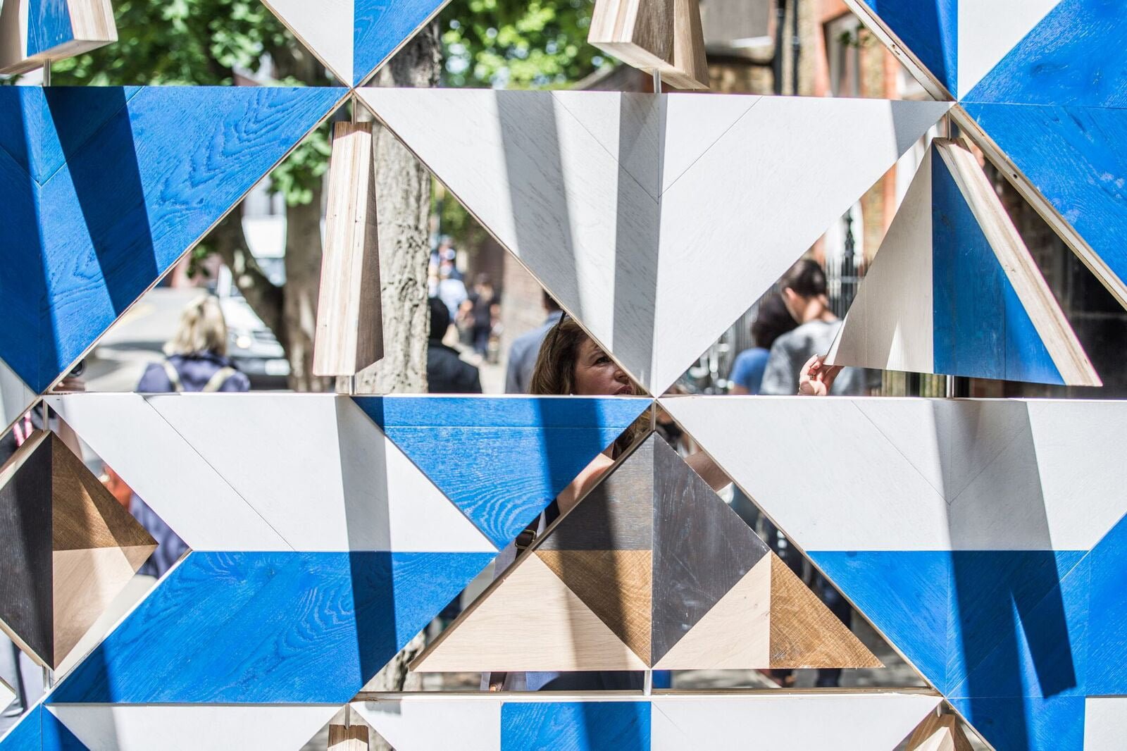 The immersive patterned landscape comprises of Hakwood’s iconic wood Wall Tiles that can be rearranged and rotated to create a space that invites guests to explore, play, and connect with pattern in a direct and physical way. The design of the installation toys whimsically with scale to create an almost infinite tunnel effect, reflecting the endless possibilities of working with the wall tile range and responding directly to the tunnel-like form of Clerkenwell Close itself.