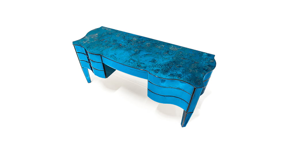 Our most iconic piece was inspired by the Art Deco era, a beautiful blue bevelled mirror clad and curved dressing table, each piece of glass was expertly cut, polished, bevelled, heated and bent in a kiln to provide the right curvature without distorting the surface of the glass and so keeping the clarity and perfection of the silvered finish. Combining a modern style with fine exquisite craftsmanship, very expensive materials and rich colours into a modernistic piece of furniture, truly a one-off.