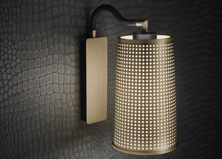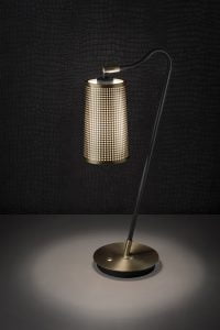 Inspired by industrial designs, the Roma table lamp by Chelsom fuses cutting edge design with the latest technology. Available as part of a wider collection of coordinated wall, floor and ceiling lighting, Roma features tapered perforated metal shades finished in Golden Bronze with internal PVC Opal diffusers to give a dramatic and softly diffused light effect.