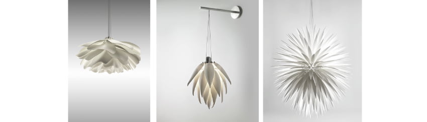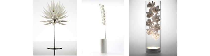 Pieces from his collections include the dramatic “White Flax”, consisting of 350 handcrafted ceramic leaves, specifically arranged for even light distribution that pushes the limits of its medium and craftsmanship and the beautiful “Cymbidium Chandelier” made from eight up lit porcelain cymbidium stems.