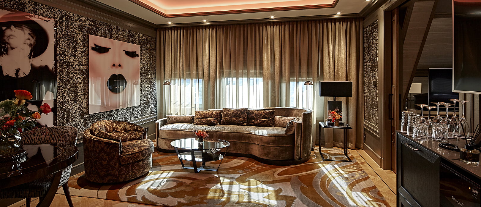 The listed building from the era of the industrial revolution has 16 exquisitely equipped suites – from small junior suites to signature suites larger than 200 square metres. The opulent furnishing concept is signed by Wim van de Oudeweetering & Cris van Amsterdam: top quality carpets from Nepal, handcrafted Italian curtains, exclusive wallpaper by Pierre Frey France, sumptuous sofas by Ascension Lattore and modern artworks by Cobra Art.