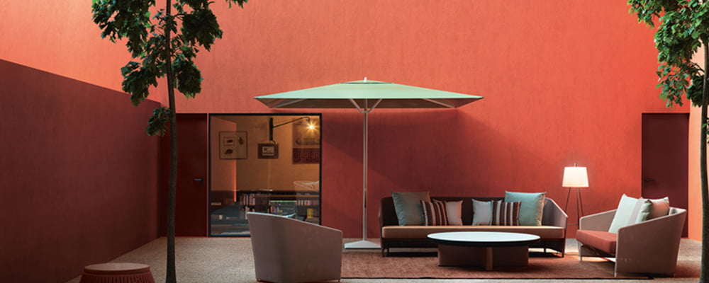 The increasing impact of parasols and other sunshade systems on the planning and furnishing of modern cityscapes, recreational resorts and private dwellings gives rise to the challenge of a renewed approach to this specialised product category.