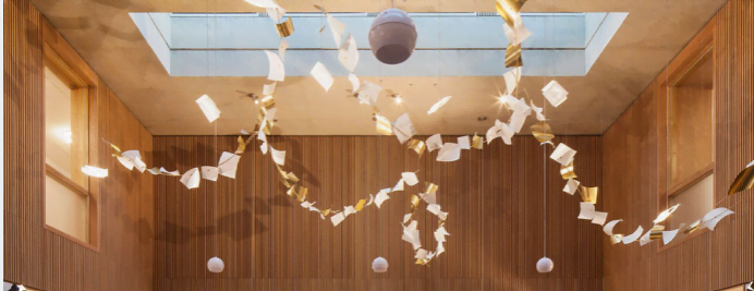In the café and social space, Nulty commissioned Haberdashery design studio to develop a lighting sculpture inspired by the fascinating written and photographic history of Newnham College and the prints of Japanese artist Hokusai. Designed to represent 270 pages of paper flying through the air, the ‘pages’ made of brass or powder-coated steel are etched with historical college documents and letters written by women associated with the college. Small LED lights are positioned on some of the ‘pages’ and carefully targeted spotlights positioned on nearby walls allow light to be reflected from the piece. The documents etched onto ‘pages’ of the lighting sculpture are: