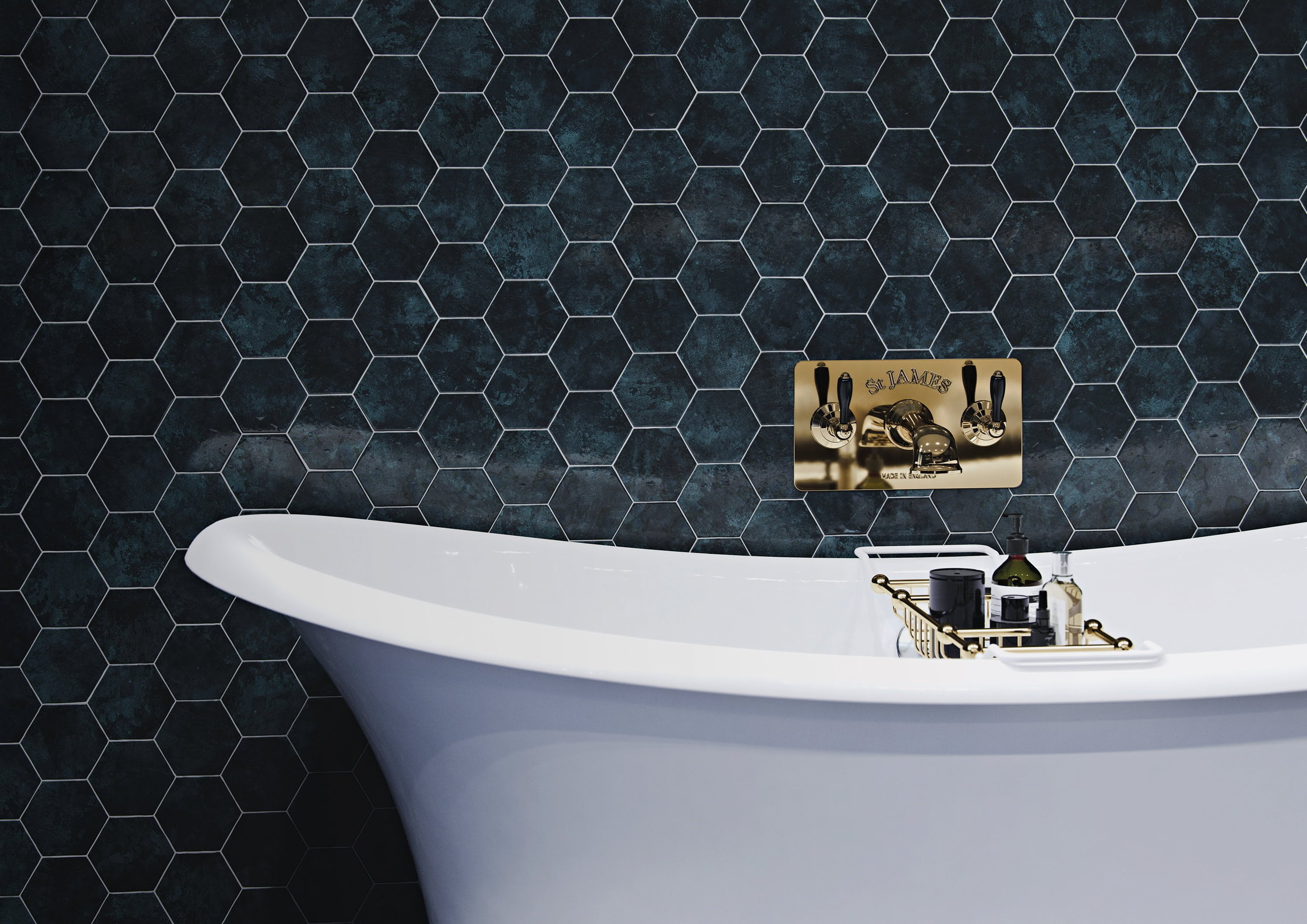 The St James Collection by Marflow is the epitome of Victorian-inspired luxury. Include this brassware in a bathroom scheme to emphasise a sense of wellbeing and sheer indulgence. Each piece is handcrafted in solid brass with a choice finishes, including Antique Gold as shown here, Bright Nickel and Brushed Copper. Choose between metal and black or white porcelain handles or for an ultra-luxe result, clear or black crystal handles. Shown here, three-hole wall mounted bath filler with engraved concealing plate and black porcelain London levers.