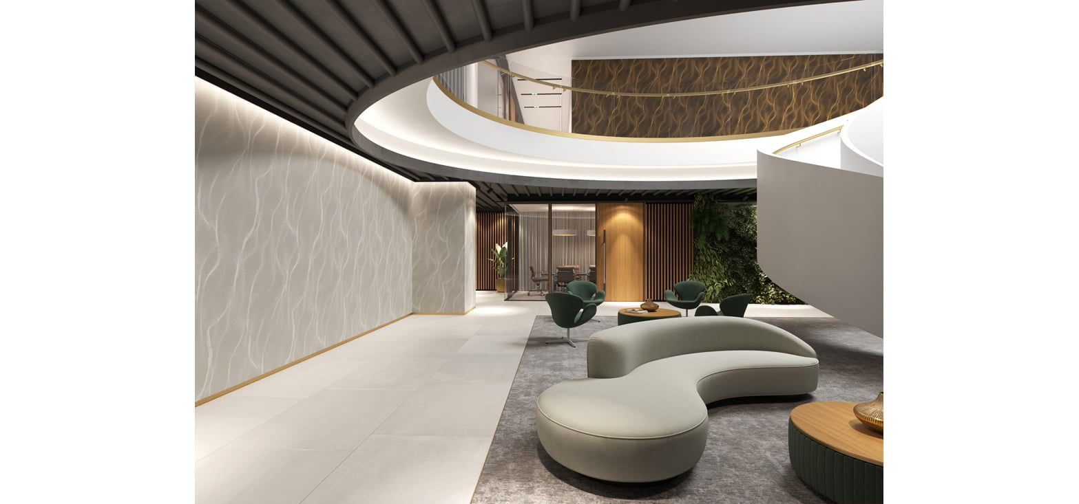 The collection comes in three designs: Muse Fluid evokes the movement of the ocean and is available is five colourways (Ice, Ivory, Goldeneye, Lavender and Emerald); Muse Cloudy is based around a series of varying dots that converge to produce a ‘cloud-like’ effect and contains three options (Sandstone, Starlight and Foam); finally the cross-hatch style design Muse Mineral can be specified in two different versions (Calcite and Steel).